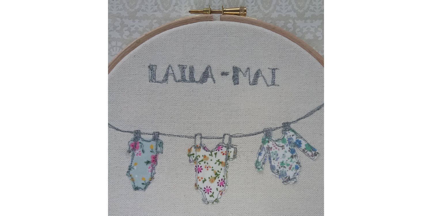 What better way to welcome the birth of a new baby than with this clothes on line embroidery design download. It can be made personal to the baby by playing with a variety of base fabrics, colours and stitches. The name of the baby can also be embroidered on too if you wish. The illustration by Annie Morris features a washing line with three pieces of baby clothing hung up to dry.